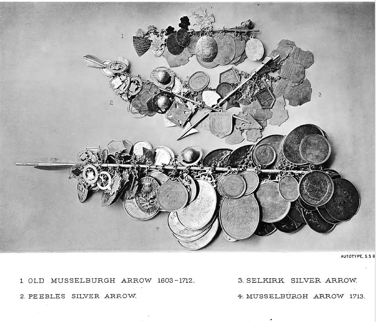 “In 1784 Dr Spens presented an ancient bow and a pair of arrows, [italics mine] to be shot for on seven successive Saturdays . . . . But one of the most valuable and interesting prizes which the Company has ever shot for was brought under their notice during this year. At the dinner after the competition for the Edinburgh Arrow, Mr. Grieve, the Lord Provost of the city, and Mr. Alexander, the Provost of Peebles . . . were both admitted members of the Royal Company without payment of fees. The latter gentleman brought with him a silver arrow belonging to the town of which he was chief magistrate, and which bore medals dated so long ago as 1661. The Council [of the Company], it is stated, ‘desirous that so ancient a prize should be revived and shot for annually [italics mine], signified their wishes that Provost Alexander mention their inclinations to his brethren of the Town-council of Peebles with regard thereto, and inform [the Council] of their resolutions upon the matter.’ Meanwhile the arrow was left in the hands of the Treasurer of the Company; and the wishes of the Council, as we shall see, were afterwards complied with.”