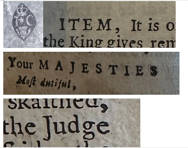 There has been recent commentary suggesting that the “I” on the stamp is actually a “J.” However, this claim lacks any supporting evidence. A quick review of the 1682 publication of The Scots Laws and Acts of Parliament shows both capital letters “I” and “J” in use. On one of the first pages, shown below, the word “MAJESTIES” is printed in capital letters using a font similar to what was used in “PARLIAMENT.” This font clearly approximates if not matches the “I” and “R” seen on the King James VI coins and aligns with the lettering on the Troon stamp. When comparing the “I” and “J” from “MAJESTIES” and the “I” in “PARLIMENT” to the first letter of the Troon stamp, it becomes clear that the first letter of the Troon stamp looks like an “I,” not a “J.”