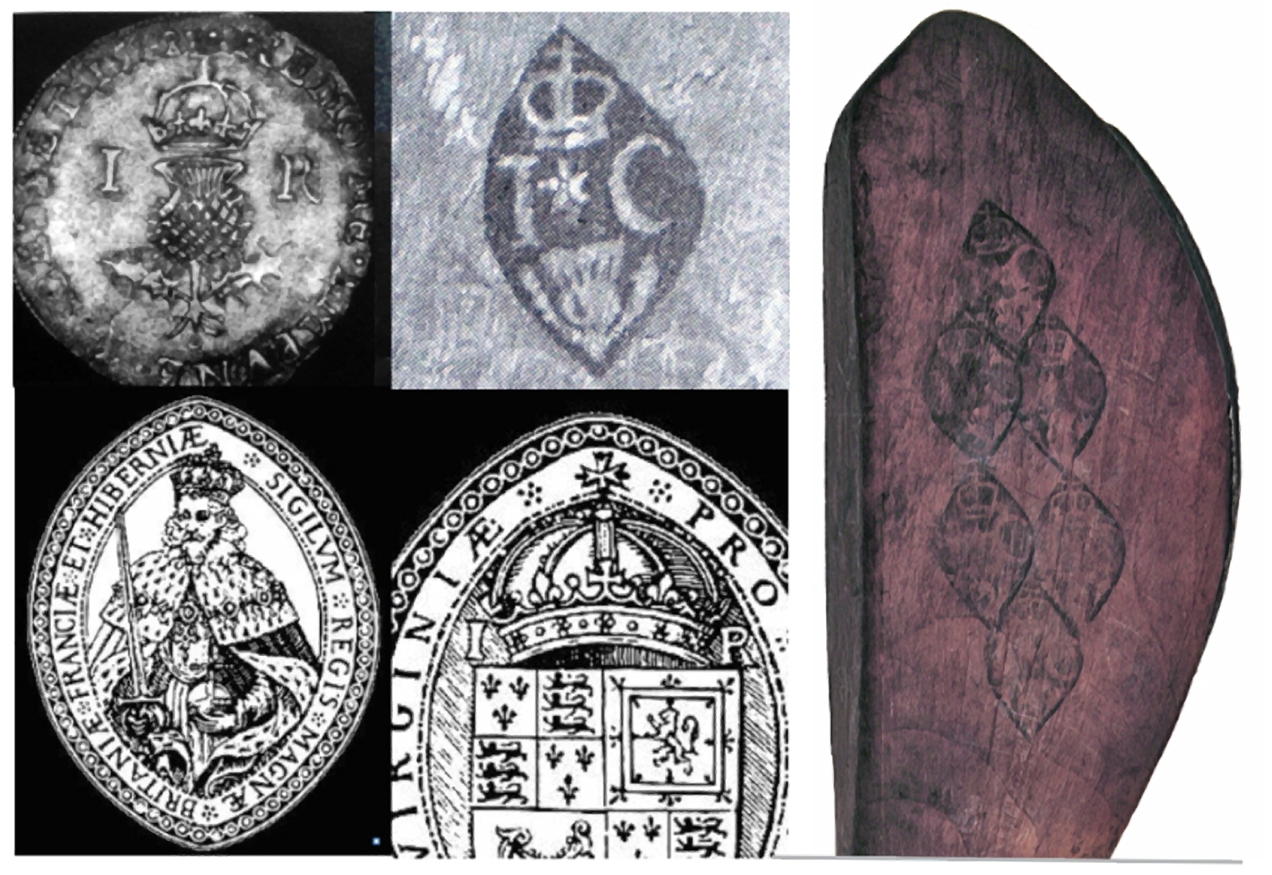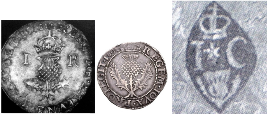 Like the 1582 coin on the left, the coin in the center was also produced by King James VI/I. However, the thistle leaves on this coin, minted between 1601 and 1604, are long and angled upwards, resembling those on the Troon stamp. Therefore, the slight difference in the leaves between the 1582 coin and the Troon stamp, crafted after 1602, is inconsequential, illustrating that different versions of an insignia can still represent the same monarch. Again, this is why the overall unified symbol of the insignia, its general appearance and presentation, is key.