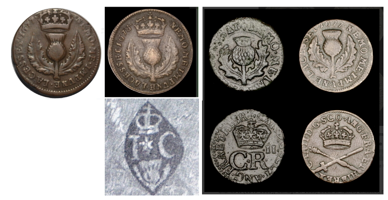 Charles II coins (James Carstairs, clubmaker): As shown on the six coins below, when Charles II became king he changed the layout of his cypher, the design of the crown, and included the Roman numeral II. When he used a thistle he changed its design as well, to help make his insignia unique.