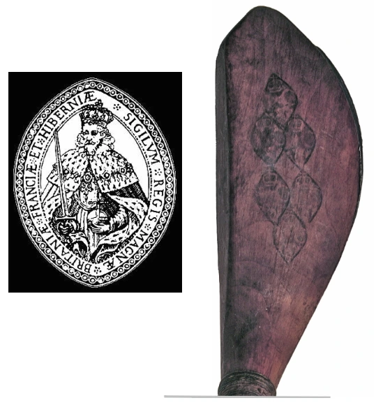 The vesica piscis used to frame the insignia also connects to James VI/I. It is a Christian symbol that James VI/I embraced and was known to use to identify himself. In tandem with his royal insignia, both serve to identify the king behind the clubs.