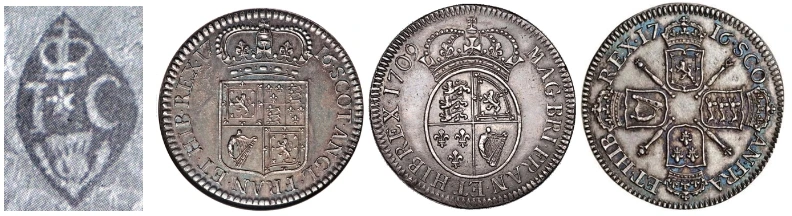James VIII Coins (Ruling Authority 1701 - 1766 and Father of Bonnie Prince Charlie): In my coin search, I was unable to locate any coins produced by James VIII that included initials or a crowned thistle.2 Below are the James VIII coins I found that come the closest to matching the Troon stamp. Instead of his initials, James VIII used various versions of the Royal Arms of the United Kingdom under his crown, at least on the coins I located.