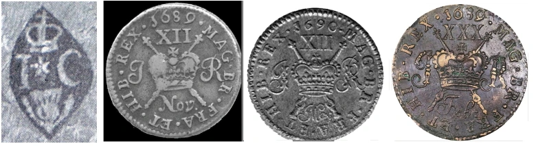 King James VII Coins (Grandfather of Bonnie Prince Charlie): In my search, I was unable to find any King James VII coins that included a crowned thistle bordered by two initials. I did locate several gun money coins produced by King James VII in 1689 and 1690 that included a crown and two initials, as shown below, but no thistle. Unlike the James VI/I coins, the crown is overlaid above two crossed scepters and between the initials, which are in script. This layout, a crown between two Latin initials, is another royal cypher that is different from all others. The coins below are the James VII coins that come the closest to matching to the Troon stamp, at least of all the James VII coins I viewed.